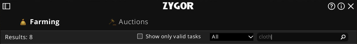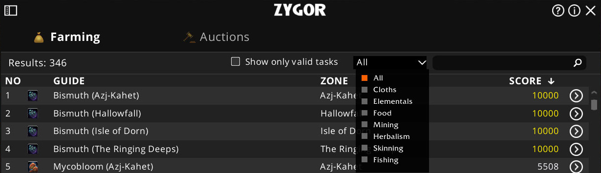 You can also filter the results by the type of item you want to farm including: Cloths, Elementals, Food, Mining, Herbalism, Skinning, and Fishing.
